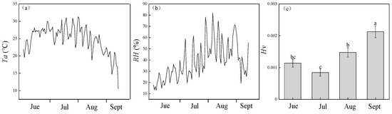 (a) Variability in daily mean temperature (Ta, °C) and (b) daily mean relative humidity (RH, %), and (c) seasonal change in Huber value (HV). Lower-case letters denote significance levels from Analysis of variance (ANOVA) based on post hoc means using least significant difference test (LSD) analysis (p < 0.05). Data in (c) are means with standard error.