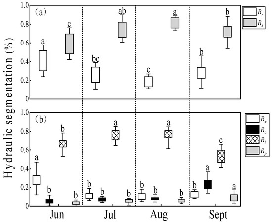 The order of hydraulic segmentation from largest to smallest for different plant parts was as follows: leaf blades, shoots, and petioles. The hydraulic resistance ratio of leaf blades (Rl) was about 50%–76%, noticeably more than that of the other parts in each month. The hydraulic resistance ratio of current-year shoots (Rc) and petioles (Rp) increased respectively from 8% and 6% in June to August to 24% and 11% in September. On the contrary, one-year shoots (Rx) exhibited a notable decline in hydraulic resistance ratio from 28% to 12% in July, with little change in the other months. The hydraulic resistance ratios of one-year shoots (Rx) were higher than those of current-year shoots (Rc), and those of petioles (Rp) and Rc stabilized before the end of leaf growth. However, at the end of leaf growth, Rc and Rp sharply increased and eventually Rc exceeded Rx (Figure 3b). This indicated that roots played the role with less hydraulic limitation and leaves were the parts with the greatest hydraulic limitation of the branches.