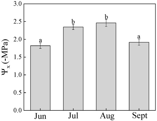 The differences in hydraulic segmentation at different times of the day were not statistically significant (p > 0.05). The differences in hydraulic segmentation across months were highly significant (p < 0.01). The hydraulic resistance ratio of the whole-shoot (Rs) was about 60%–82%, which was much larger than that of the whole-root (Rr). Rs increased from June to August and then decreased from August to September; that trend was reversed for Rr (Figure 3a). The root contribution to hydraulic resistance (Rr) had the same trend as twig water potential. Water potential was lower in July and August and higher in June and September, with a decreasing, and later, increasing trend (Figure 4).
