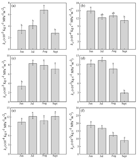 Strong diurnal trends in LSC were absent in all parts of the plant (p > 0.05), while the effect of the month was significant (p < 0.05). LSC of whole-shoots (ksl) remained stable across consecutive months (Figure 6b). Unlike ksl, LSC of whole-root (krl) remained stable until it markedly increased in August (Figure 6a). Most notably, there was a small monthly change in LSC of leaf blades (kll). The value was about 1.14 (± 0.09) × 10−3 kg s−1 MPa−1 m−2 (Figure 6e). LSC of current-year shoots (kcl) did not change until a notable decrease in September (Figure 6d). LSC of one-year shoots (kxl) increased from June to July, and then stabilized (Figure 6c). Moreover, LSC of petioles (kpl) decreased from July to September (Figure 6f). This indicated that changes in LSC in other plant parts occurred to ensure relative stability of LSC in leaf blades, which maintained a stable water supply per leaf area.