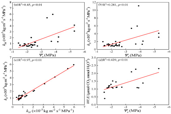 Regression analysis for dehydration treatments: (a) twig water potential (Ψx) and LSC of leafy branches (kbl), (b) twig water potential (Ψx) and LSC of leaf blades (kll), (c) LSC of leafy branches (kbl) and LSC of leaf blades (kll), and (d) twig water potential (Ψx) and water use efficiency (WUE). All regressions shown were highly significant (p < 0.01).