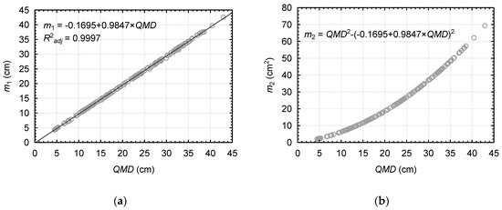 The relationship between the first raw moment m1 and the QMD was statistically significant (F(1,161) = 554072.2; p < 0.0001), with the values of the constant term (t = −5.36; p < 0.0001) and slope (t = 744.36; p < 0.0001) being significantly different from 0 (Figure 1a). The adjusted determination coefficient was 0.9997. After substituting the above equation (Equation (23)) into the empirical formula (Equation (9)) for the second central moment m2, the latter assumes the following form: