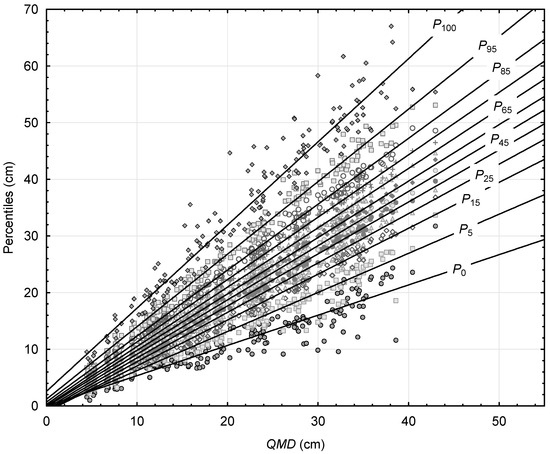 Relationships between the 12 percentiles and the QMD in the stands studied are given in Figure 2. The fit of the developed system of seemingly unrelated equations assessed by McElroy’s R2 is 0.9994, with R2adj ranging from 0.850 to 0.998 for individual equations (Table 2). The lowest goodness-of-fit, as expressed by the adjusted determination coefficient and mean squared error (MSE), was found for the extreme percentiles P0 (R2adj = 0.850; MSE = 4.70) and P100 (R2adj = 0.934; MSE = 13.27). Goodness-of-fit increased for percentiles closer to the center with the best fit obtained for P55 (R2adj = 0.998; MSE = 0.15).