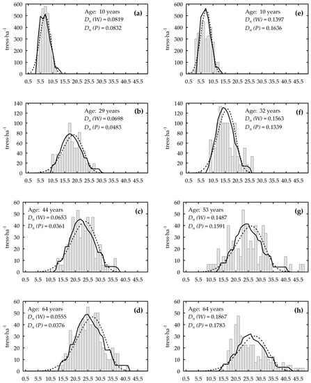 - Stankova, T.V.; Zlatanov, T.M. Modeling diameter distribution of Austrian black pine (Pinus nigra Arn.) plantations: A comparison of the Weibull frequency distribution function and percentile-based projection methods. Eur J. For. Res. 2010, 129, 1169–1179. [Google Scholar] [CrossRef]