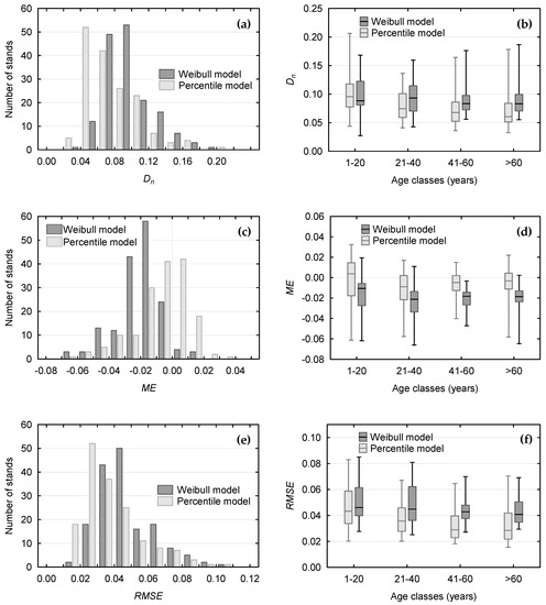 Distributions of goodness-of-fit statistics: (a,b) Kolmogorov–Smirnov Dn statistic, (c,d) mean error (ME), (e,f) root mean squared error (RMSE) for the fitted Weibull and percentile models in black alder stands.