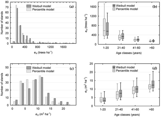 The distribution of the error index eN was similar for both diameter distribution models (Figure 5). The index ranged from 83.0 to 1677.4 trees·ha−1 for the Weibull model and from 78.8 to 1997.3 trees·ha−1 for the percentile model, with the mean values being 315.0 trees·ha−1 and 314.0 trees·ha−1, respectively (Table 5). Despite these similar results, the Wilcoxon signed-rank test for all stands revealed significant differences between the median values of eN for the two models (Z = 4.499; p < 0.05; Table 6). Significant differences between the Weibull and percentile models were found in stands older than 20 years, whereas in the youngest group of stands (1–20 years), the two models revealed similar eN (Table 6; Figure 5). The same pattern was found for the error index eG, which was calculated using the BAs of the various DBH classes as weights. Also in this case, the mean error index for the percentile model was lower than for the Weibull model, both, for all stands as a whole and for individual age classes (Table 5; Figure 5). Statistically significant differences were again found for stands older than 20 years, while in the youngest ones the null hypothesis could not be rejected (Wilcoxon signed-rank test; Table 6).