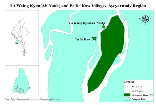 Two villages—Padekaw village (15° 59.232′ N and 95° 15.765′ E) and Lawinekyun (A Nauk) (16° 0.586′ N and 95° 15.866′ E)—were selected as study areas to analyze the socio-economic conditions. These two villages were selected with the criteria of accessibility, near the Meinmahla Kyun Wildlife reserve, and affected by cyclone Nargis in 2008. Because most of the villages in that area can only be accessed by boat, we selected these two research areas as they are a little easier to access by boat. Table 1 shows the general information of the two villages. Local communities living in that area survive by working cultivation of paddy fields and fisheries. Sources of employment include crop farming (mainly paddy rice cultivation), horticulture (mostly fruit trees), paid agricultural labor, fishing (fishponds, shrimp farms, inland and offshore fisheries), small- and medium-scale agricultural and fish processing and small-scale forestry activities (firewood, charcoal and timber). Some income is derived from commerce and small-scale local trade which is indirectly reliant on the environment as the target customers of those trades and businesses are natural resource-dependent. Most of the economic activities in that area are at the subsistence level. Most men in the coastal areas are fishermen while women and children are collectors of inter-tidal mollusks, fish and prawns. These products are an important source of income to both fishermen and those engaged in processing and trading. The Delta region has many challenges such as capacity development and infrastructure for hygienic drinking water and better education and healthcare. Most of the households use firewood as fuel energy for cooking and heating. Access to the villages of the studied area was difficult because of poor transport infrastructure and few all-season roads that travel between villages that are often conducted by boat. Households in the studied villages use rainwater for drinking and cooking, however they often cannot collect enough rainwater. Figure 1 shows the location of the study area.