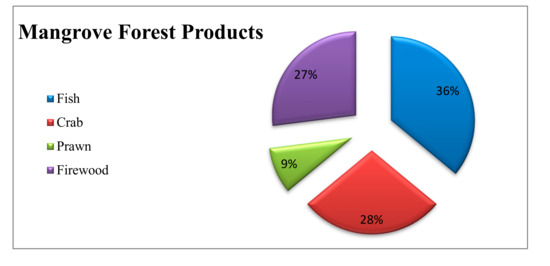 Income from the collection of mangrove forest products was the highest income source in the study. About 53% of sample households generated their livelihood income from the use of different mangrove forest products. The result indicates that mangrove products harvested by the local people from the study area are fuelwood, fish, crab and prawn. The main contributions in both villages are fish and crab. Their usage of timber products collected from mangrove forest is mostly for subsistence purposes such as building material and firewood because in that area they mainly use firewood as fuel for cooking. These two studied villages are dependent on the mangrove forest resources provided by a Meinmahla Kyun wetland reserve. Timbers from mangrove trees are used as poles, firewood and charcoal making for domestic purposes such as cooking, heating and ironing. Mangroves are the source of fuelwood for cooking in the rural area. Fisheries and prawn catch in particular depend on intact mangrove ecosystems. Villagers in the studied sites engage in traditional fish collection from the mangrove areas. The mangrove dwellers basically understand the daily tidal conditions by calculating the days based on the Myanmar lunar calendar [23]. Almost all of the respondents in two villages collected fish, crab and prawns at 10 to 15 days per month as they were dependent on a tidal cycle. Tidal inundation is more frequent and widespread during the period of the lunar cycle. During that period, people could harvest more fish, crab and prawn. Income share from fishing, crab, prawn and firewood were 36%, 28%, 9% and 27%, respectively. Figure 2 presents the major mangrove forest products in the study area.
