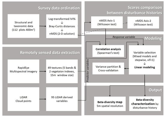 Flowchart representing the whole procedure. Log-transformed percentage Importance Value Indexes (IVI%) of the species at plot level were ordinated onto a 2-D non-metric multidimensional scaling ordination (nMDS). Differences between disturbance histories were tested for each axis-scores, and the axis sensitive to that was linearly modeled. As predicted variables, textures of the five bands and two vegetation indexes were calculated from RapidEye Multispectral imagery and 95 LiDAR-derived variables. Spearman’s correlations were calculated between the response variable and the predictor variables, and the variable selection was performed using iteratively a linear mixed model that includes as fixed effect the covariate to be tested, and a random effect that takes into account that there exists other covariates that needs to be considered. We finally rank the variables from the lower p-values, and apply a stepwise selection procedure to the top ten covariates. Linear dependencies were explored by computing the variables’ variance inflation factors (VIF). The relative importance of LiDAR and RapidEye derived variance was assessed. Model predictive ability was assessed via ten-fold cross-validation and the final model was used to map it for the study area extent, each disturbance history with a characteristic position in the compositional ordination space (-diversity).