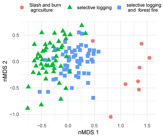 Non-metric Multidimensional Scaling (nMDS) ordination scatter plot, for the study plots by disturbance history. Stress value = 0.23.