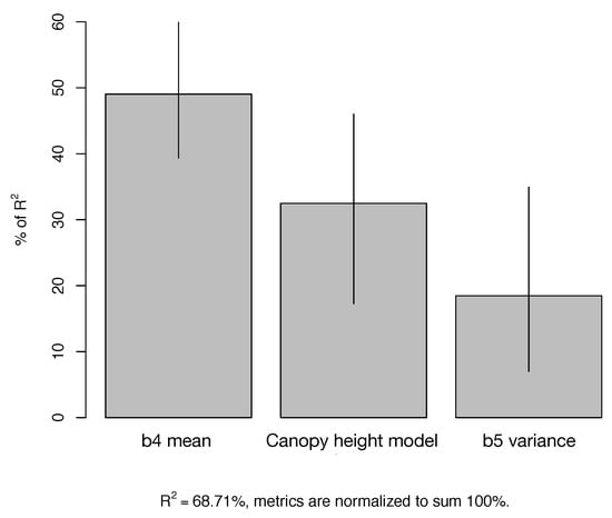 Then, a backward stepwise multiple linear regression of the top ten variables was performed to select the best explanatory variables. Linear dependencies were explored by computing the variables’ variance inflation factors (VIF). The “lmg” function in the “Relaimpo” package [] was used to assess the relative importance of LiDAR and RapidEye derived variables. This function calculate the proportion of contribution of each variable makes to the , considering both, its direct effect and its effect when combined with the other variables in the regression equation. Metrics were normalized to sum to 100% of the explained variance, and 95%-bootstrap confidence intervals of the relative weights were calculated using the “boot.relimp” function [] with 1000 bootstrap replications.