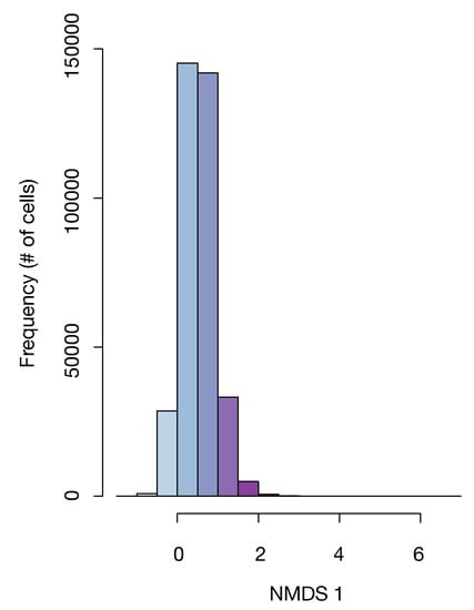 The tree -diversity of a region of interest can be summarized in a floristic gradient in which the more similar the calculated value, the more akin the tree species composition is. It is usually generated by an ordination method like the detrended correspondence analysis [,], or more often with ordination methods based on Bray–Curtis distances as the non-metric multidimensional scaling (nMDS) [,,,,,,,], or the isomap []. It helps to illustrate the mechanistic basis for the interpretation that is not apparent from high dimensional species composition data, and it is also advantageous because it preserve the general pattern in the original composition matrix, avoiding problems related to the large number of zero observations [,].