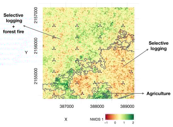 We hypothesized that -diversity, summarized in a floristic gradient through an nMDS ordination, can be efficiently modeled with variables derived from LiDAR, and multispectral textures and that the common disturbance history areas will have less inner dissimilarity. It was supposed because as a result of the disturbance, a variation in tree species composition occurs and forest general attributes change [], being some of the changing traits, like leaf structure, foliar chemistry or stand structure [] trackable from remote sensing tools [,]. Our objectives were to map -diversity as a floristic gradient in a continuous way with remote sensing technologies over a tropical landscape, and to relate it to different disturbance histories.