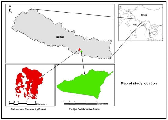 The study investigated two community-based forest management models (one CF and one CFM). These were Shibeshwor CF in the Hariyon municipality, and Phuljor CFM in the Ishworpur municipality, which cover a total area of 3121 hectares of forested area (the CF covering 711 hectares, and CFM 2419 hectares) (see Figure 1). The Shibeshwor CF comprised 719 households with a population of 4496, while Phuljor CFM consisted of 27,953 households with 161,730 residents [48]. Local users were living both nearby and far from the forests. The nearby users in both the CF and CFM live in the foothills. Agriculture and animal husbandry are the mainstays of their livelihoods. The distant users in the CF live in the semi-urban area and have multiple livelihood options including commercial agriculture, services, and small shops. The distant users in the CFM live some distance away from the forest (>5–20 kilometres) and also depend on agriculture and animal husbandry for their livelihoods [48]. The reasons for selecting these two CBFMs are: (1) both of them have both nearby and distant users; (2) they have a long history of community participation in forest management; (3) the areas are endowed with rich ecosystems [49]. The outcomes of the study are highly applicable to the wider Chure region and to the CBFM model globally.