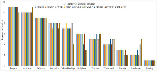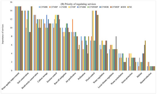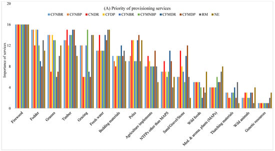 Different subgroups had different priorities. Considering all subgroups within the CF, the top three provisioning services were firewood, fodder, timber, grasses, and fresh water. Similarly, the top three regulating and cultural services were WQI, SC, FC, bequest, aesthetic, and existence values.