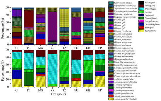 AMF community composition in the rhizosphere soils of different tree species. Tree species: CI, Carya illinoensis; PL, Populus lasiocarpa; MG, Metasequoia glyptostroboides; ZS, Zelkova serrata; TZ, Taxodium ‘zhongshansha’; GB, Ginkgo biloba; EP, Elaeagnus pungens.