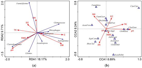 The redundancy analysis (RDA) (a) and canonical correspondence analysis (CCA) (b) of AMF genera and species with edaphic factors. AcauExcv, Acaulospora excavate; AcauFove, Acaulospora foveata; AcauRehm, Acaulospora rehmii; AmbsLept, Ambispora leptoticha; ClarClar, Claroideoglomus claroideum; ClarEtum, Claroideoglomus etunicatum; FunnGeos, Funneliformis geosporum; FunnMoss, Funneliformis mosseae; GlomMult, Glomus multiforum; GlomPust, Glomus pustulatum; GlomRetc, Glomus reticulatum; RhizAggr, Rhizophagus aggregatus; RhizClar, Rhizophagus clarus; Rhizintr, Rhizophagus intraradices; SeptCons, Septoglomus constrictum.