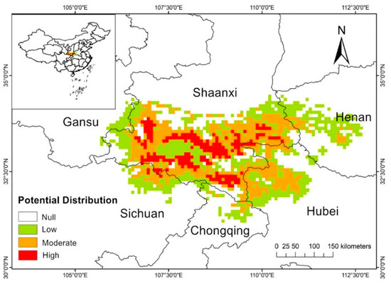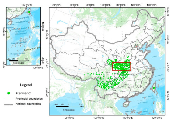 We used a proxy study area that covered the natural distribution of P. armandi, which was located between 24° N and 36° N and between 98° E and 111° E, and it included multiple climate type zones (Figure 1). In order to better understand the climatic environment of D. armandi, the distribution profile of the host is as follows (Table 1) [27,28].