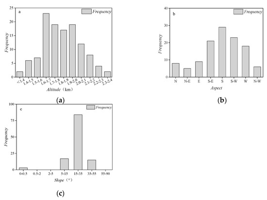 The frequency histogram of terrain variables. (a) altitude; (b) aspect. The aspect is measured counterclockwise in degrees, ranging from 0 degrees (true north) to 360 degrees (still true north, one cycle); and, (c) slope. According to the Geomorphological Survey and Geomorphologic Mapping Committee of the International Geographical Union, the grades of slopes are classified, as follows: 0°–0.5° for plains, 0.5°–2° for micro-slopes,2°–5° is a gentle slope, 5°–15° is a slope, 15°–35° is a steep slope, 35°–55° is a steep slope, and 55°–90° is a vertical wall.