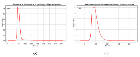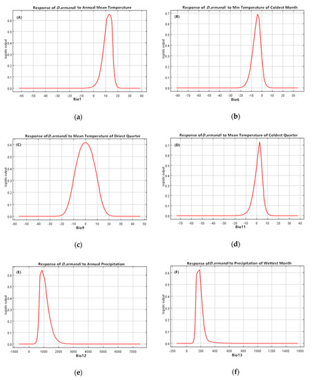 Eight predictor bioclimatic variables were selected. Temperature variables Bio1, Bio6, Bio9, and Bio11 and precipitation variables Bio12, Bio13, Bio16, and Bio18. The responses of the bioclimate variables that influenced the potential geographical distribution of D. armandi are shown in response curves (Figure 3). These response curves show changes in the logistic prediction when each environmental variable changes by keeping all the other environment variables at their average value. In addition, altitude, aspect, slope, and the distribution of the host were also added in the analysis.