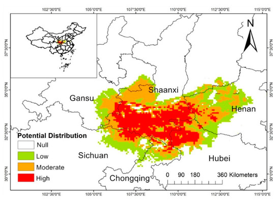 Potential distribution of D. armandi in China modeled with MaxEnt.