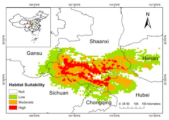 Habitat suitability (HS) for D. armandi in China modeled with ENFA.