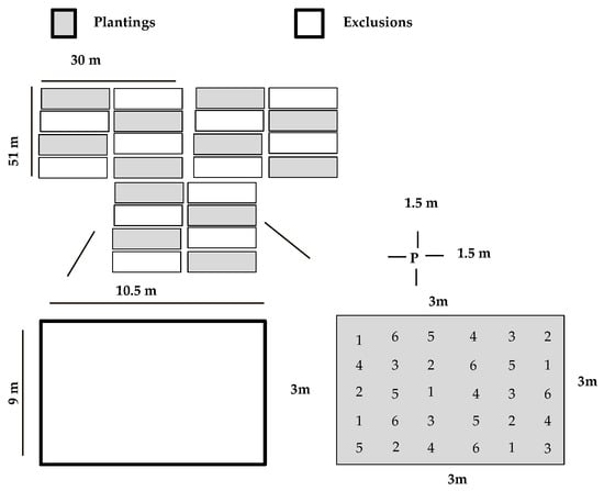 The experiment was carried out in two locations. Location A was 1124 m a.s.l. with a 25% slope, and location B was 1116 m a.s.l. with a slope of 16%. Three 51 m × 30 m sites were established in each location. Each site had eight 10.5 m × 9 m plots separated by 3 m, for a total of 48 plots. Plots were systematically assigned to one of two restoration interventions (Figure 1). Twenty-four plots from both locations were left to undergo natural succession (minimal intervention) and in the other 24 plots, mixed plantings of six native tree species were established in July 2013. Seedlings were planted with 1.5 m of separation, with five seedlings per species per plot. Three of the species have been ranked as fast-growing (Acacia coulteri Benth., Leucaena esculenta (DC.) Benth. and Spondias mombin L.), and the other three species have been ranked as slow-growing (Erythrina americana Mill., Lysiloma divaricatum (Jacq.) J.F. Macbr. and Crescentia alata Kunth; Table 1). All plants were donated by the Ministry of Sustainable Development of the Government of the State of Morelos; they were one year old and 30–50 cm in height. Seedling survival and height and base diameter were evaluated at the beginning (July) and end of the rainy season (November) from 2013 to 2016.