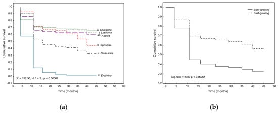 Kaplar–Meier curves of survival of (a) six tree species and (b) slow- and fast-growing species after 40 months growing in fenced plots at Quilamula, Morelos, Mexico. Species that do not share a letter showed significantly different survival under the log-rank comparison tests.