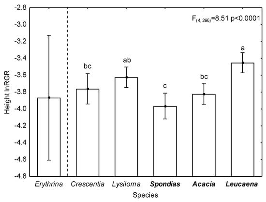 Forty months’ height lnRGR of six tree species growing in fenced plots at Quilamula, Morelos, Mexico. Height lnRGR for Erythrina americana is shown but this species was removed from RGR analysis due to low survival. Different letters show significant differences evaluated with Tukey test. Genera of fast-growing species are shown in bold.