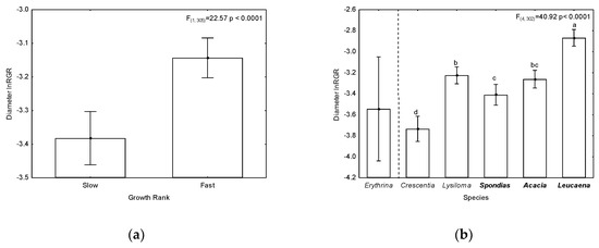 Logarithmic relative growth rates in diameter at the base (diameter lnRGR) after 40 months of growth varied twice among five tree species. On average, three fast-growing species had significantly higher diameter lnRGR (RGR = 4.31%) than two slow-growing species (RGR = 3.39%) (F (1, 305) = 22.57, p < 0.00001; Figure 4a). Leucaena had the highest diameter lnRGR (RGR = 5.67%) and Crescentia the lowest diameter lnRGR (RGR = 2.38%). The analysis of variance revealed significant differences in diameter lnRGR among species (F (4, 302) = 40.92, p < 0.00001). The post hoc Tukey test revealed that Leucaena had significantly higher diameter lnRGR than the rest of the species (Figure 4b).