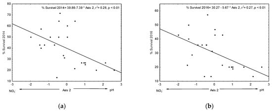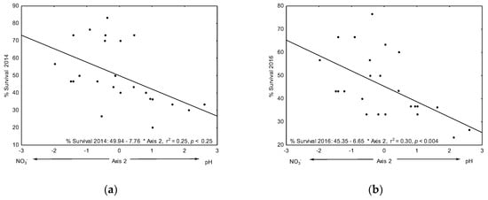 The first two axes of the Principal Component Analysis of soil properties for 2013 were not correlated with the survival of all six tree species in 2014 and 2016 (Table S4a), nor with the survival of fast- or slow-growing species (Table S4b). The PCA axis 1 of soil properties for 2014 was not correlated with the survival of 2014 and 2016 (Table S5a) nor with the survival of fast- or slow-growing species (Table S5b). The PCA axis 2 of soil properties for 2014 was correlated with the survival of 2014 (Figure 5a) and the survival of 2016 (Figure 5b) for all species. The PCA axis 2 of soil properties for 2014 was correlated with the survival of slow-growing species in 2014 (Figure 6a) and in 2016 (Figure 6b).