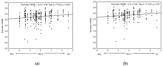 The first two axes of the PCA of soil characteristics for 2013 and 2014 were not correlated with the height lnRGR for the six tree species (Table S6) nor with the height lnRGR of fast- or slow-growing species (Table S6). The first two axes of the PCA of soil characteristics for 2013 were not correlated with the diameter lnRGR for the six tree species (Table S7) nor with the diameter lnRGR of fast- or slow-growing species (Table S7). The PCA axis 1 of soil characteristics for 2014 was not correlated with the diameter lnRGR (Table S7) nor with the diameter lnRGR of fast- or slow-growing species (Table S7). The PCA axis 2 of soil characteristics for 2014 was correlated with the diameter lnRGR for all species (Figure 7a) and for fast-growing species (Figure 7b).