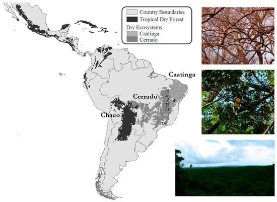 Location of the tropical dry forests (TDFs) in Central and South America. The dry ecosystems also include the Brazilian Cerrado (savanna) and Caatinga (Data from Portillo-Quintero and Sanchez-Azofeifa 2010; photos from Antonio Guzman Quesada).