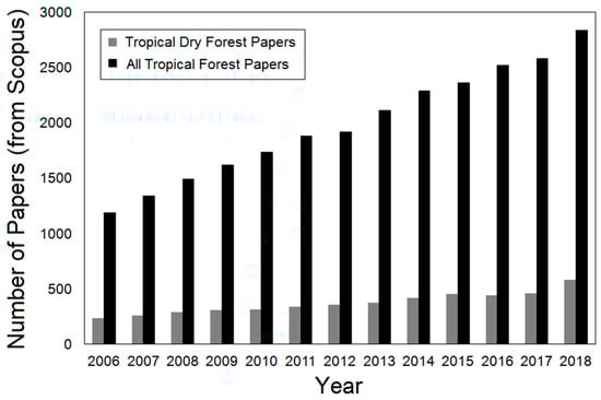 Tropical dry forests have the third highest deforestation rate globally and are subject to high anthropogenic alteration [,,]. Much of this deforestation is due to high population densities, which creates a predominantly fragmented landscape [,]. The high population densities in TDFs are due to climate, geography, and a high number of neotropical freshwater sources []; however, despite its regional and global importance, it remains severely under-studied relative to the humid forest []. Only 14% of tropical forest scientific papers, until 2005, focused on tropical dry forests, with a heavy emphasis on Costa Rica, Mexico, and Brazil [,,]. Since 2005, research into TDFs has been increasing but it still only comprises less than 25% of research into tropical forests annually (Figure 2).
