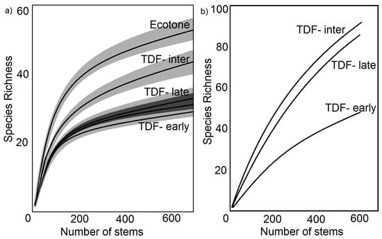Species richness and the number of stems by successional stage reproduced from Minas Gerais, Brazil as found in Coelho et al. (a) [] and from Santa Rosa National Park, Costa Rica, based on data from Kalacska et al. (b) []. Intermediate stage TDFs have the highest species richness of the secondary TDFs. The ecotone consists of a combination of primary TDF and savanna land.
