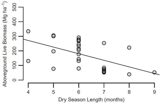 While species diversity may not be significantly related to precipitation, biomass and water availability are positively correlated. In Bolivia, for example, TDF gross primary productivity (GPP) anomalies have historically (from 1980–2009) been correlated to precipitation anomalies (R2 = 0.8) and increases in the dry season by one day could decrease GPP by up to 1.2% []. On a global scale, there is a significant decrease in AGB when plots have a longer dry season, with an average reduction of 40 Mg/ha per additional month in the dry season, although this is highly variable by plot (Figure 4) [].