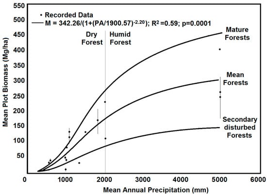 The relationship between mean annual precipitation and forest biomass for primary and secondary forests. The relationship increases and then levels out in the humid forests []. The figure is reproduced under CC 4.0 from Navar-Chaidez [] and includes additional points for Mata Seca, Brazil, and Santa Rosa, Costa Rica collected from Enviro-Net field data.