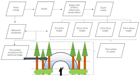 The CBI is based on visual estimation and judgement to assess vegetation coverage at different height strata (Box 1). To simulate human vision and to derive values based more closely on the CBI protocol, all 3D data are converted to a spherical coordinate system to create a human vision-oriented image (Figure 2 and Figure 3). Based on TLS sensor location, all XYZ 3D coordinates of voxels are converted to three variables in spherical coordinates: distance, horizontal angles (Ɵ), and vertical angles (Φ). The degrees of horizontal and vertical angles are displayed in X and Y axis to make a human vision-oriented image shown in Figure 3. Then, the counted pixels on the image are compared with counted voxels to quantify the visual bias for the different height strata. The voxels displayed in orthogonal coordinates are paired with the satellite image displayed in plain view. To visualize the bias effect, the voxels in each height stratum in the orthogonal coordinates are counted in total, and the number of pixels (in spherical coordinates) visible on the human vision-oriented image in each height strata are also counted. To compare the voxelization method with our simulation of CBI field assessment, the counted total is normalized with the maximum number on a scale from 0 to 1, for each of the height strata, in each scan. A natural logarithmic equation is applied to obtain the non-linear relationship of the visual bias between x in spherical and y in orthogonal coordinates.