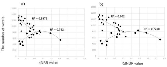 The relationship between the total number of voxels at each plot and (a) dNBR and (b) RdNBR values (marker ●: recently burned plots, ♦: unburned plots, the bold fonts of R2 values are statistically significant for the linear case and not-significant for the non-linear case with a significant level of 0.05).