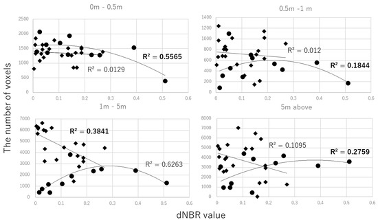 The relationship between dNBR and the number of voxels at different heights or strata (marker ●: recently burned plot, ♦: unburned plot, the bold fonts of R2 values are statistically significant for the linear case and not-significant for the non-linear case with a significant level of 0.05).