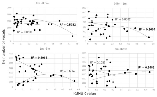 The relationship between RdNBR and the number of voxels at different heights or strata (marker ●: recently burned plot, ♦: unburned plot, the bold fonts of R2 values are statistically significant for the linear case and not-significant for the non-linear case with a significant level of 0.05).