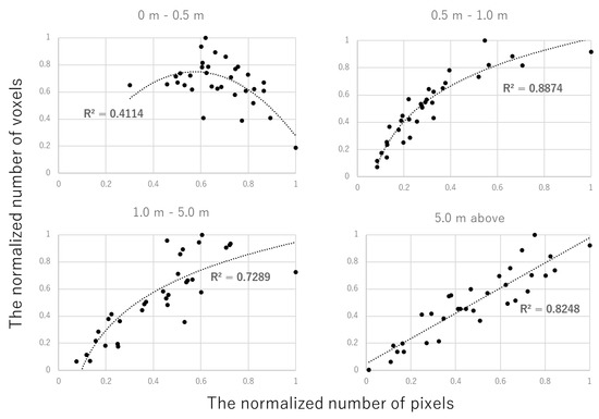 The relationship between the number of pixels in spherical coordinates (x) and the number of voxels in orthogonal coordinates (y) by different height strata (both axes are normalized by the maximum number and all R2 values are statistically significant for the linear case and not-significant for the non-linear case with a significant level of 0.05).