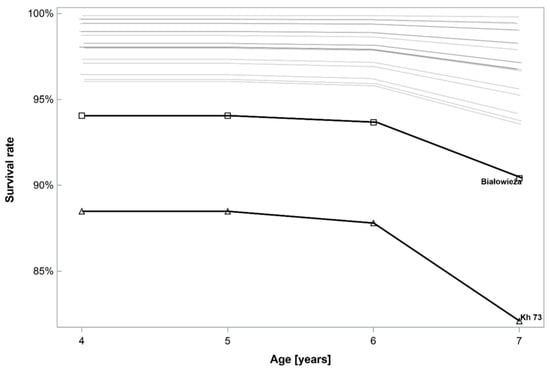 Trend lines in survival rate for clones over time. The bold line with square symbols indicates the trend for a mixture of 30 clones of P. tremula (TA) plus trees from wild populations in the Białowieża Forest (Białowieża = reference), and the bold line with triangle symbols for the clone with the lowest survival rate.