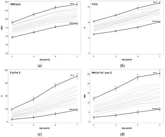 Trend lines of (a) mean diameter at breast height (DBH), (b) height (H), (c) stem volume (V) and (d) mean annual increment (MAI)) for clones over time. The bold line with square symbols indicates a trend for a mixture of 30 clones of P. tremula L. (TA) plus trees from wild populations in the Białowieża Forest (Białowieża = reference), and the bold line with circle symbols for the best performing clone. Vertical bars denote standard errors.