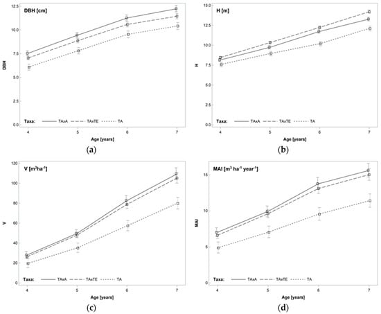 Trend lines of (a) mean diameter at breast height (DBH), (b) height (H), (c) stem volume (V ha−1) and (d) mean annual increment (MAI)) for taxa over time. Vertical bars denote standard errors. Abbreviations: TA: P. tremula L.; TA × A: P. tremula × P. alba; TA × TE: P. tremula × P. tremuloides.