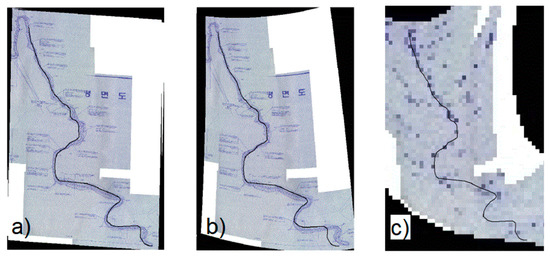 Examples of image warping using blueprints and GCP: (a) 1st transformation (linear), (b) 2nd transformation, (c) 3rd transformation. The image warping effect decreases when using the 2nd and 3rd transformations.