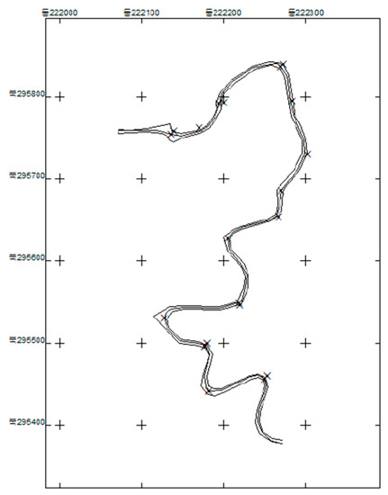 In many forest studies the positional accuracy was evaluated by measuring the difference between a known reference point and the corresponding points, and then calculating the position error (e.g., RMSE). However, it is difficult to compare the morphological differences of line segments [14,16] because mid- and endpoints in a line segment can contain disproportionate error terms [33]. Furthermore, since linear networks, such as roads, often do not have adequate comparison points, it may be more appropriate to simply compare features within a road network to a more accurate, linear reference [14,15] or to internal digital geometry [24,34,35].