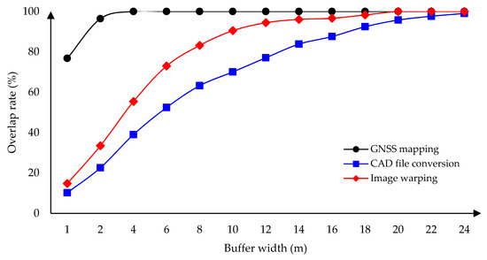 In the buffering analysis, overlaying the CAD file conversion maps on top of the reference maps resulted in a buffer width of 24 m, and greater than 95% of routes being included in the buffer range. Buffer widths, when overlapping 95% of the routes, were as follows: Gongju (16 m), Dangjin (18 m), Nonsan (18 m), Cheonsan (22 m), and Seosan (24 m) (Figure S2). Overlaying the image warping and reference maps indicated that with a buffer width of 18 m, more than 95% of the routes were included in the buffer range (Figure S3). Buffer width, when overlapping 95% of the routes, were as follows: Nonsan (10 m), Dangjin (12 m), Cheonsan (12 m), Gongju (18 m) and Seosan (18 m). GNSS mapping allowed the use of the narrowest buffer width (Figure 6). On average, more than 95% of the routes were included in the buffer range of the reference map when the buffer width was 1.5 m. When the all routes (100%) were included, buffer widths were 4 m (Figure S4).