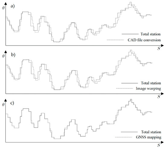Example of turning function analysis between the three mapping techniques and reference map on Nonsan: (a) CAD file conversion, (b) image warping, and (c) GNSS mapping.
