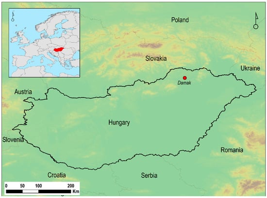 Study area: Damak Forest (red point; geographical coordinates 48°31’ N, 20°82’ E) in Borsod-Abaúj-Zemplén county, Hungary. Inset map: Hungary (red) in Europe.